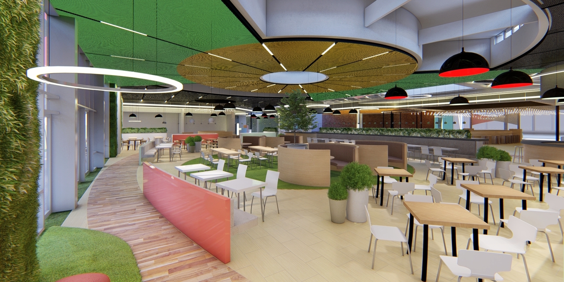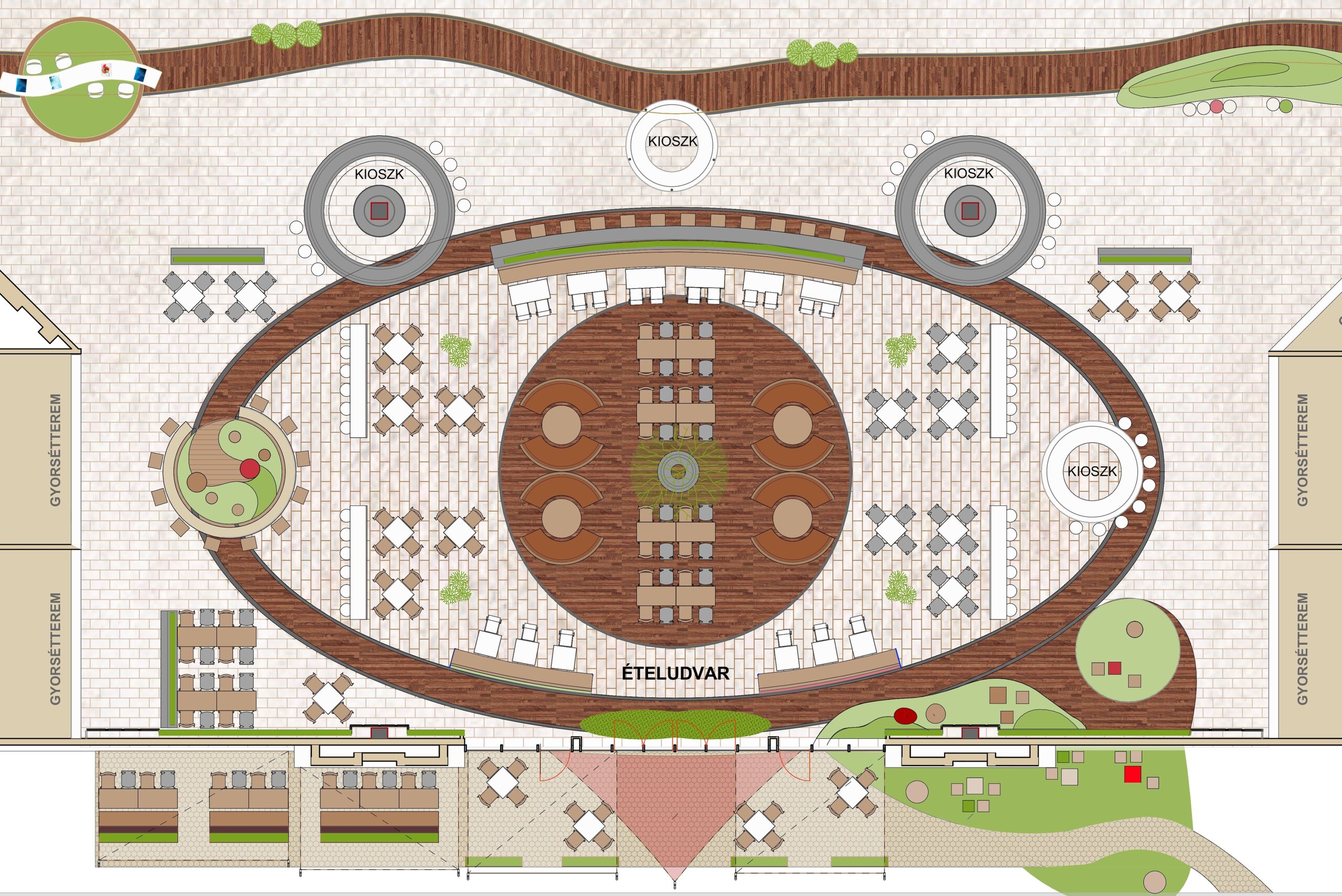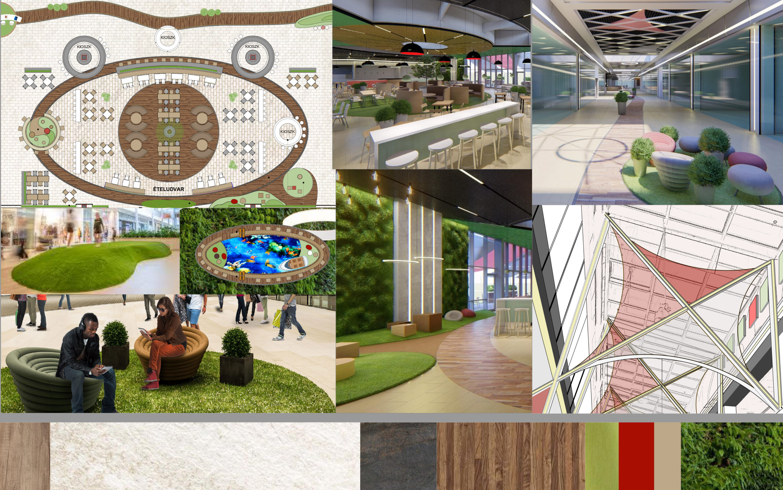 Az Auchan Soroksár az M5 Kereskedelmi Park területén helyezkedik el. A jelenlegi beruházás célja az üzletsor közlekedőinek, közösségi tereinek, ételudvarának felújítása napjaink igényeihez igazodva, szem előtt tartva a természetes színek, anyagok és modern technológiák alkalmazását. A belsőépítészeti koncepció kialakításakor az volt a célunk, hogy hangulatos, egységes, világos közösségi tereket hozzunk létre, és a belsőépítészeti eszközökkel is még inkább élménnyé tegyük a bevásárlást. A nagyvárosi zajból, nyüzsgésből ideérkező vásárlókat egy „zöld sziget” fogadja, a belső térben megjelenik a természet. A közönség a bevásárló utcákban passzázson, zöld dombok, növények közt sétálhat. Az ételudvarban a fa bútorok, a zöld fal, a sok növény, a helyenként megjelenő élénk színek és a felülvilágítókon beáramló fény, a színes lámpák, a napsárga színű kör alakú álmennyezeti rész olyan hangulatot keltenek, mintha kint a természetben, zölddel körülvett hangulatos teraszon ülnénk. Az ételudvari homlokzatot könnyed, színes napvitorlákkal árnyékoltuk. A napvitorlák játékos formája az épületben több helyen is megjelenik. A magas, fehér acélszerkezetű felülvilágítós közlekedő térben acélból egy ismétlődő keretszerkezetet terveztünk.