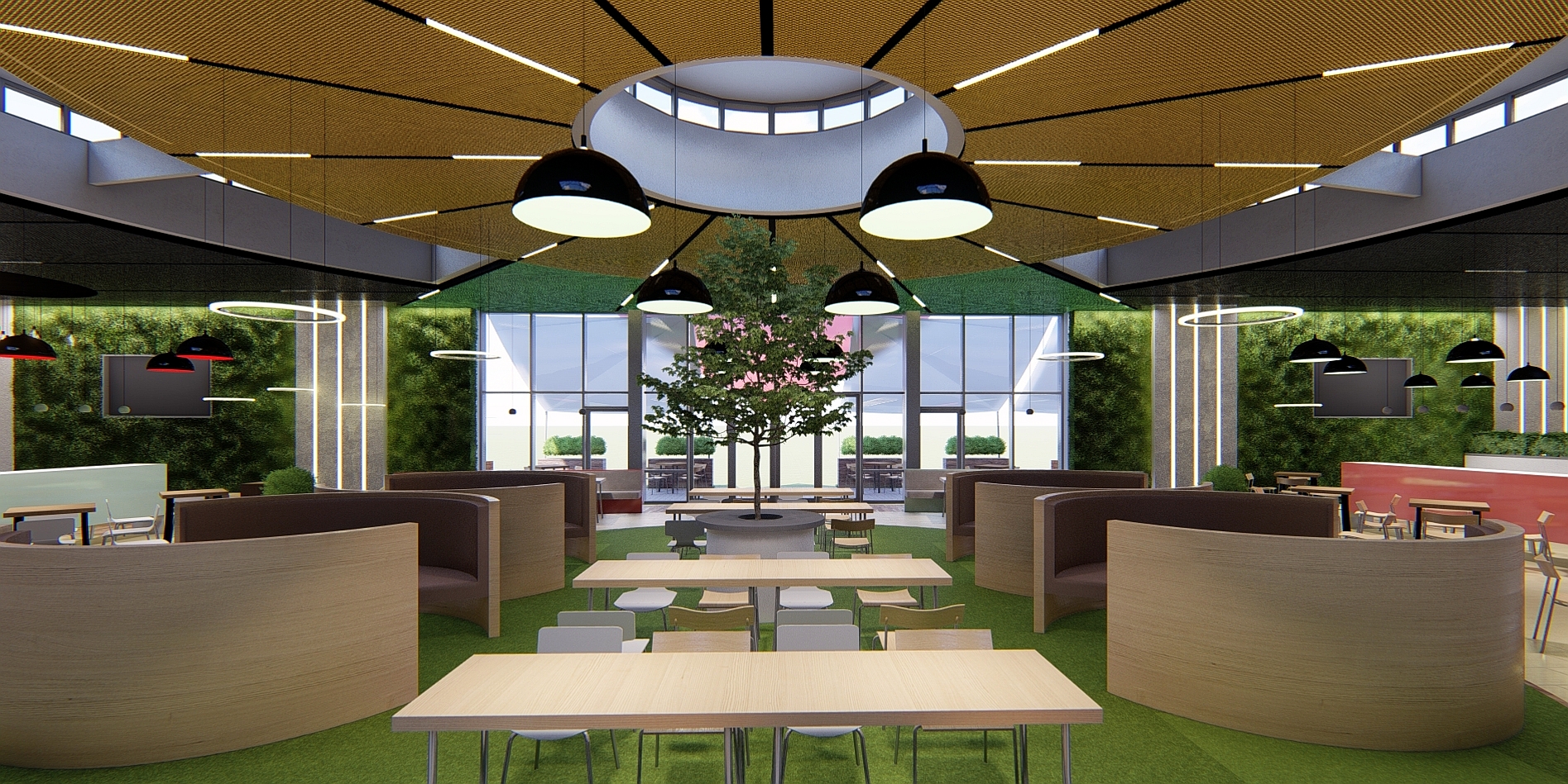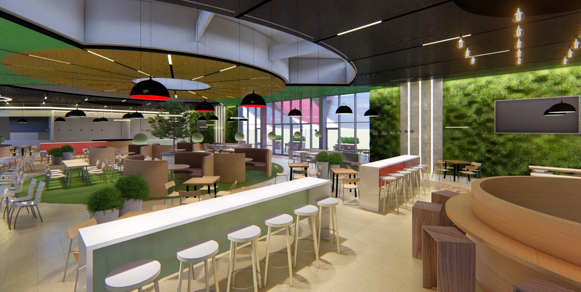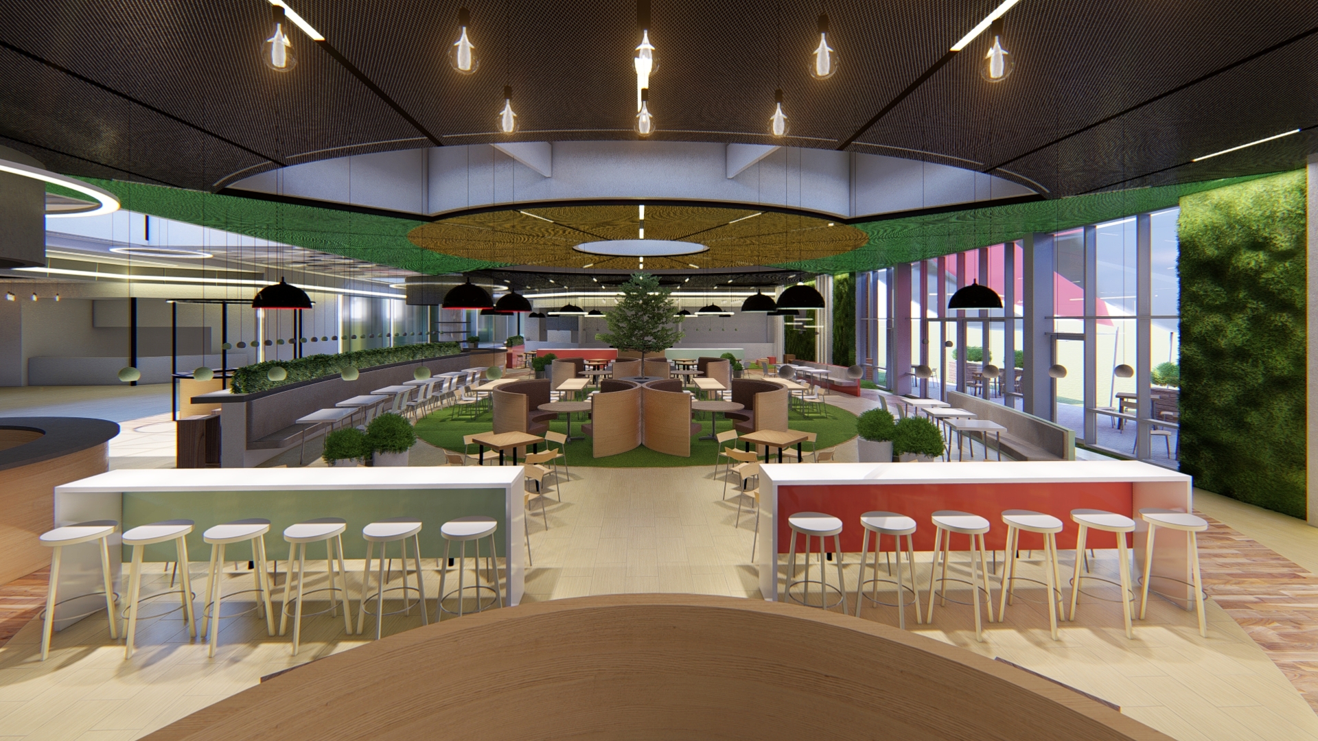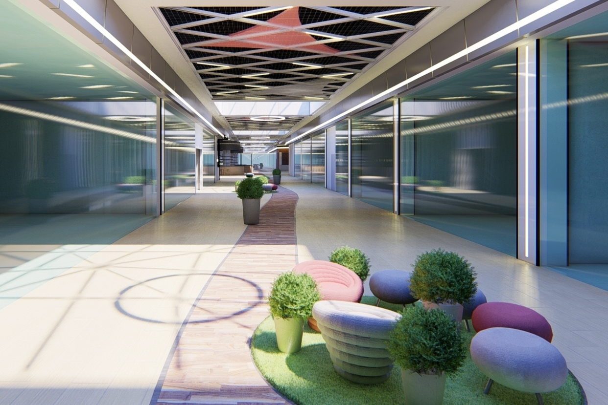 Az Auchan Soroksár az M5 Kereskedelmi Park területén helyezkedik el. A jelenlegi beruházás célja az üzletsor közlekedőinek, közösségi tereinek, ételudvarának felújítása napjaink igényeihez igazodva, szem előtt tartva a természetes színek, anyagok és modern technológiák alkalmazását. A belsőépítészeti koncepció kialakításakor az volt a célunk, hogy hangulatos, egységes, világos közösségi tereket hozzunk létre, és a belsőépítészeti eszközökkel is még inkább élménnyé tegyük a bevásárlást. A nagyvárosi zajból, nyüzsgésből ideérkező vásárlókat egy „zöld sziget” fogadja, a belső térben megjelenik a természet. A közönség a bevásárló utcákban passzázson, zöld dombok, növények közt sétálhat. Az ételudvarban a fa bútorok, a zöld fal, a sok növény, a helyenként megjelenő élénk színek és a felülvilágítókon beáramló fény, a színes lámpák, a napsárga színű kör alakú álmennyezeti rész olyan hangulatot keltenek, mintha kint a természetben, zölddel körülvett hangulatos teraszon ülnénk. Az ételudvari homlokzatot könnyed, színes napvitorlákkal árnyékoltuk. A napvitorlák játékos formája az épületben több helyen is megjelenik. A magas, fehér acélszerkezetű felülvilágítós közlekedő térben acélból egy ismétlődő keretszerkezetet terveztünk.