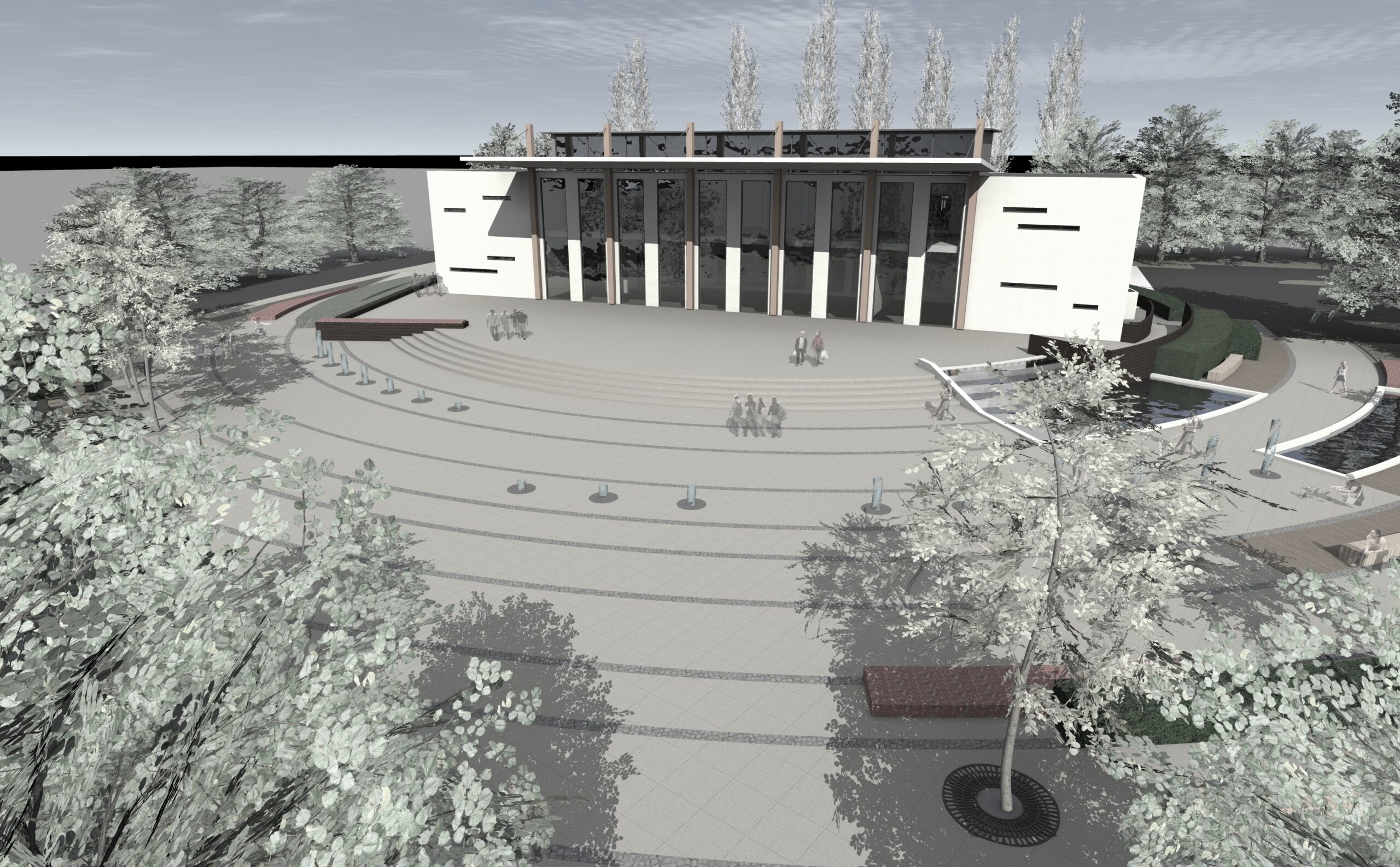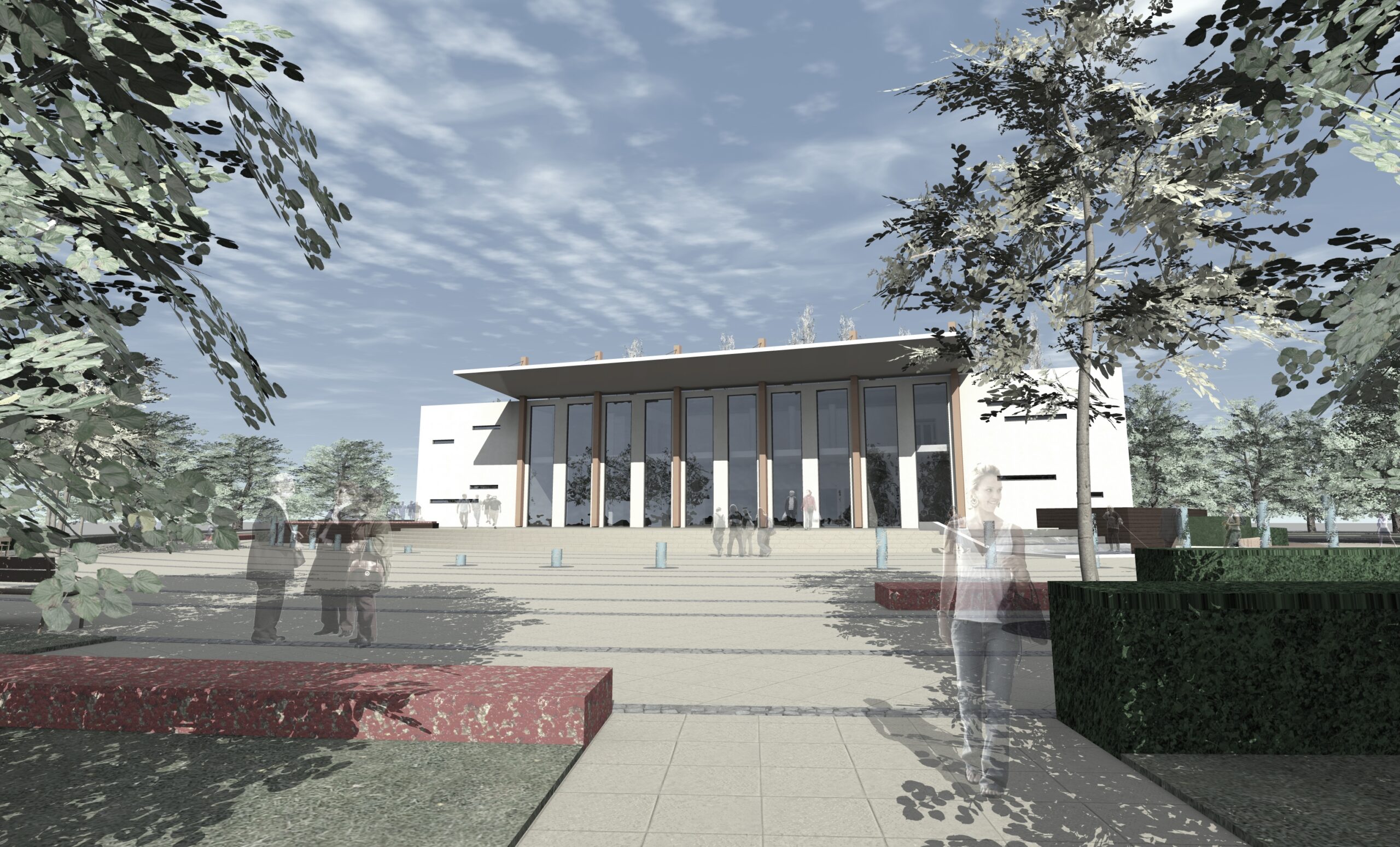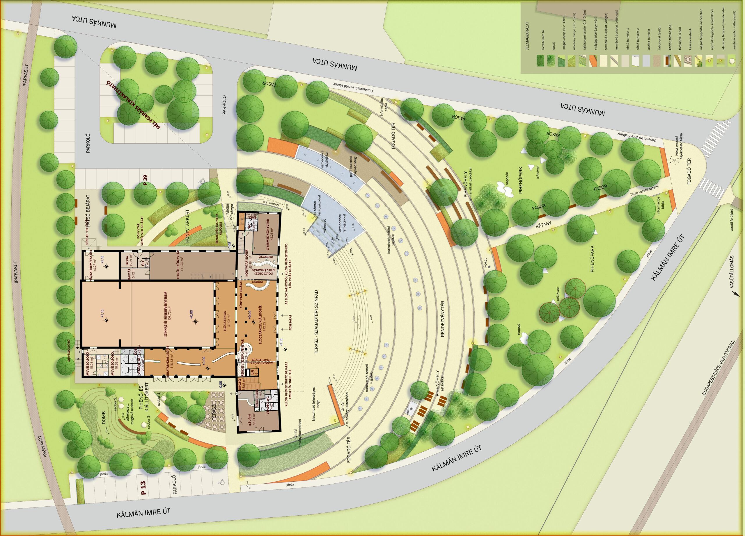 A pályázati feladat során a művelődési házat és az előtte lévő teret kellett újra gondolnunk. Célunk az volt, hogy a mûvelõdési központot körülölelõ tér kapcsolatot teremtsen a fiatalok és az idõsek, a belsõ és a külsõ világ, a mûvészet és a szórakozás, a szakmai csoportok és civilszervezetek között. Az épület belsõ átalakítása és a külsõ tér felé megnyitása élettel telíti és igazi térségi központtá emelheti a létesítményt. A város különbözõ hagyományú és beépítésû városi szövetébe egy új, modern, közösségformáló teret terveztünk. A funkcióját vesztett park és épület kapcsolatát újra értelmeztük, közösségi találkozóhelyet hoztunk létre. Az épület felnyíló üvegfala lehetõvé teszi, hogy a külsõ világ befolyjon a házba, ill. a benti rendezvények, kiáramolhassanak a szabadba. A közösségi ház elõtt a szabad rendezvénytér nagy tömegek befogadására, koncertek, könyvvásárok, ünnepi vásárok, fesztiválok, kultúrális rendezvények lebonyolítására alkalmas. A tér másik felét zöld pihenõ parkként alakítottuk ki. Az épület körül kisebb kerteket, zöldfelületeket alakítottunk ki, ahol kávézóterasz, szabadtéri kiállítótér, pihenõpadok bújnak meg a növények és az épület között.