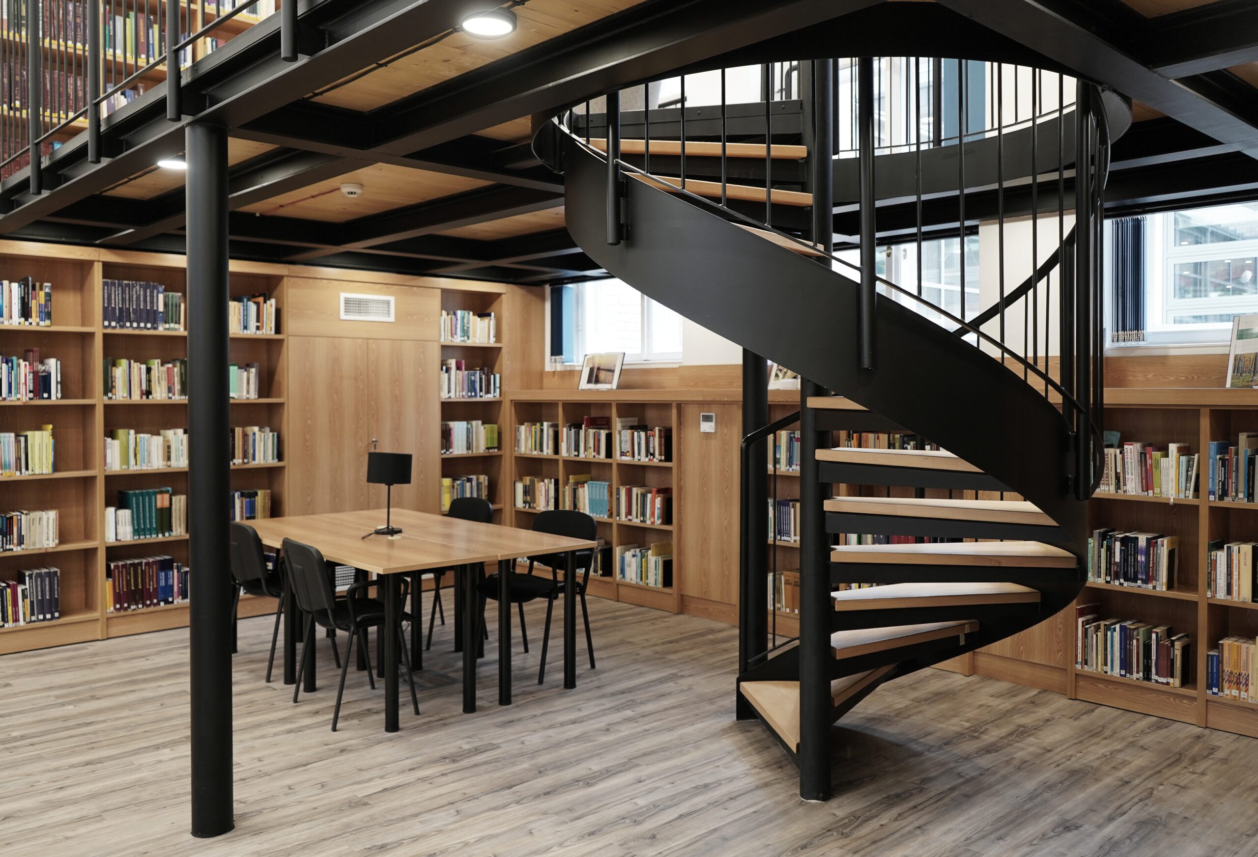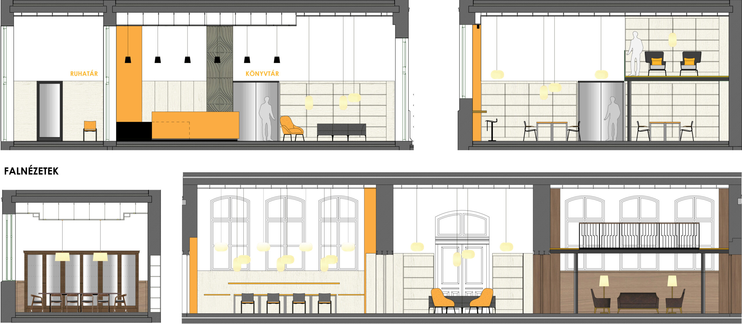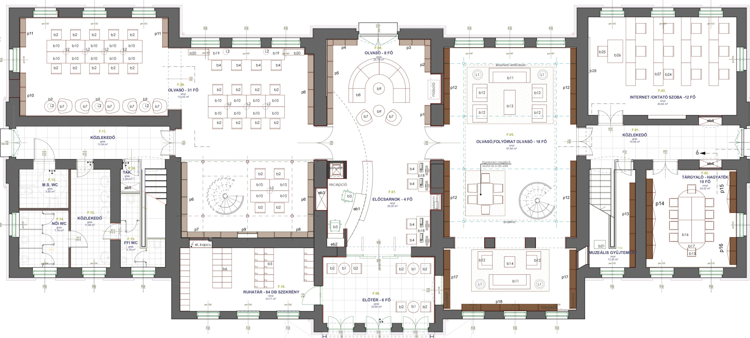 Az egyetem központi épületének átépítése során a B08 épület bontásra volt ítélve és a központi épület tervezésénél az épülettel nem is számoltak. A „K” épület építés ideje alatt született az örökségvédelmi döntés, hogy az épületet meg kell tartani. A programterv szerint az egyetemi könyvtár kerül itt elhelyezésre, ennek belsőépítészeti tervezése volt a feladatom. Az épület földszintjén az egyetemi könyvtár közönségforgalmi terei, szabadpolcos könyvespolcok, olvasótermek, folyóirat olvasó, oktatóterem, tárgyaló-hagyatéki szoba kerül kialakításra. A tetőtér és a földszint között könyvlift segítségével tudják küldeni fogadni a recepción dolgozók a könyveket. A könyvtárba belépve egy nagy belmagasságú, világos térbe érünk. Az információs pult fekete-narancs színe, egyszerű íves vonalvezetése, a világos burkolatok modern fogadóteret alkotnak. A bejárati rész, és a tőle balra eső olvasó terek világos fa burkolatúak, világos natúr színű szabad polcokkal, semleges szürke színű meleg, de nagy kopásállóságú vinyl burkolattal. A világos fa asztalok, a szürke-narancs székek kényelmes, esztétikus teret biztosítanak a könyvtár közönségének. A kialakított galéria acél szerkezetű, fa járófelülettel. A galériára betervezett 4 fiatalos, hatalmas fotel lehetőséget biztosít a nyugodt olvasásra. A bejárati előcsarnoktól jobbra eső olvasó hagyományos kialakítású tér, mintha egy időutazásban venne részt az olvasó. A bútorok sötét dió színűek, kényelmes sötét ülőgarnitúrák, mívesen kialakított acél szerkezetű galéria, hagyományos megjelenésű design lámpák biztosítják a „más típusú” hangulatot. Az álmennyezetek tervezésénél figyelembe kellett venni a galéria és a nagy összefüggő terek változó belmagasságát, a gépészeti berendezések helyigényét. Az álmennyezeti síkok különböző magasságúak, a monolit részekbe kazettás álmennyezeti szakaszok kerültek, így biztosítottuk, hogy a gépészeti berendezésekhez hozzá lehessen férni.