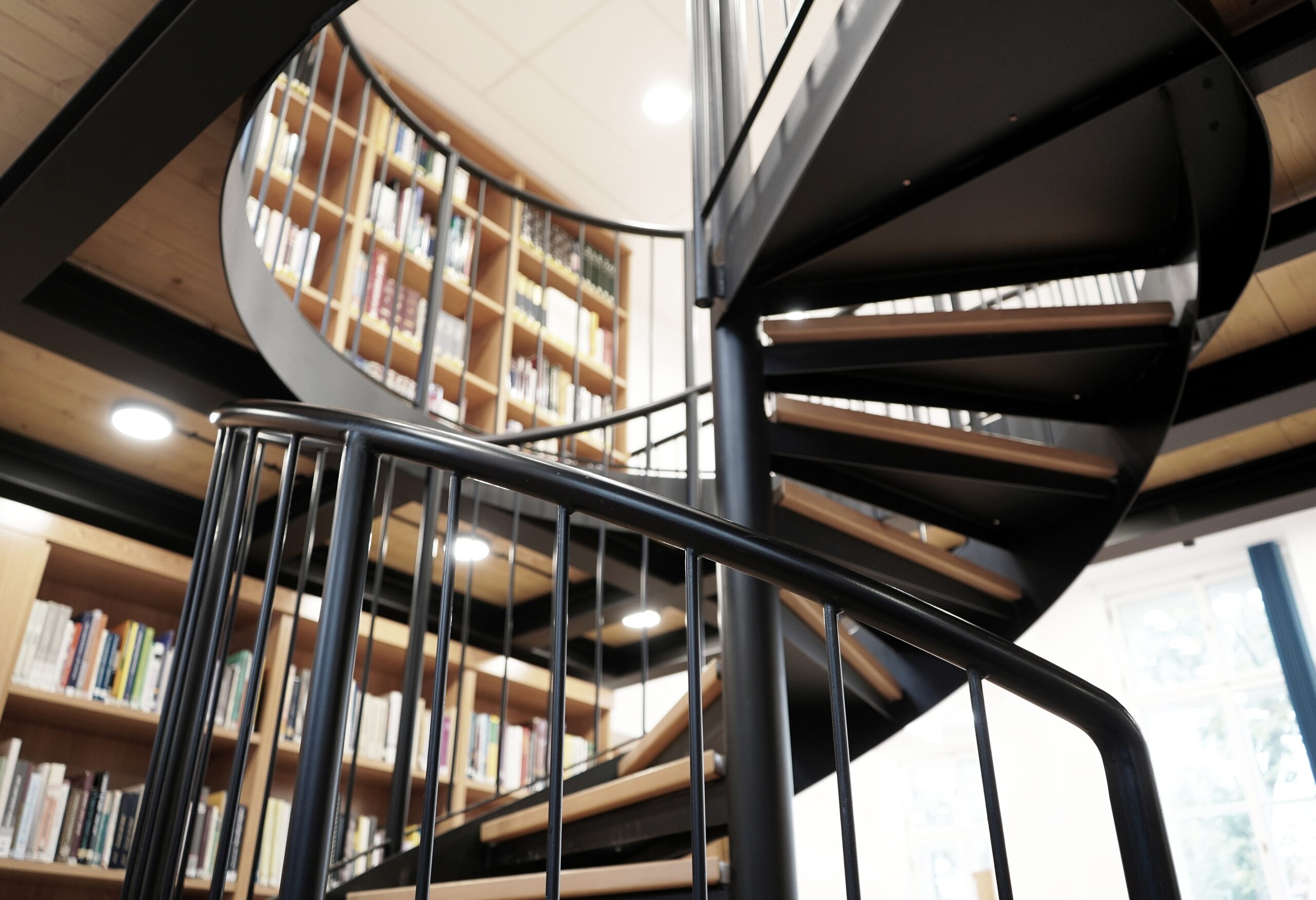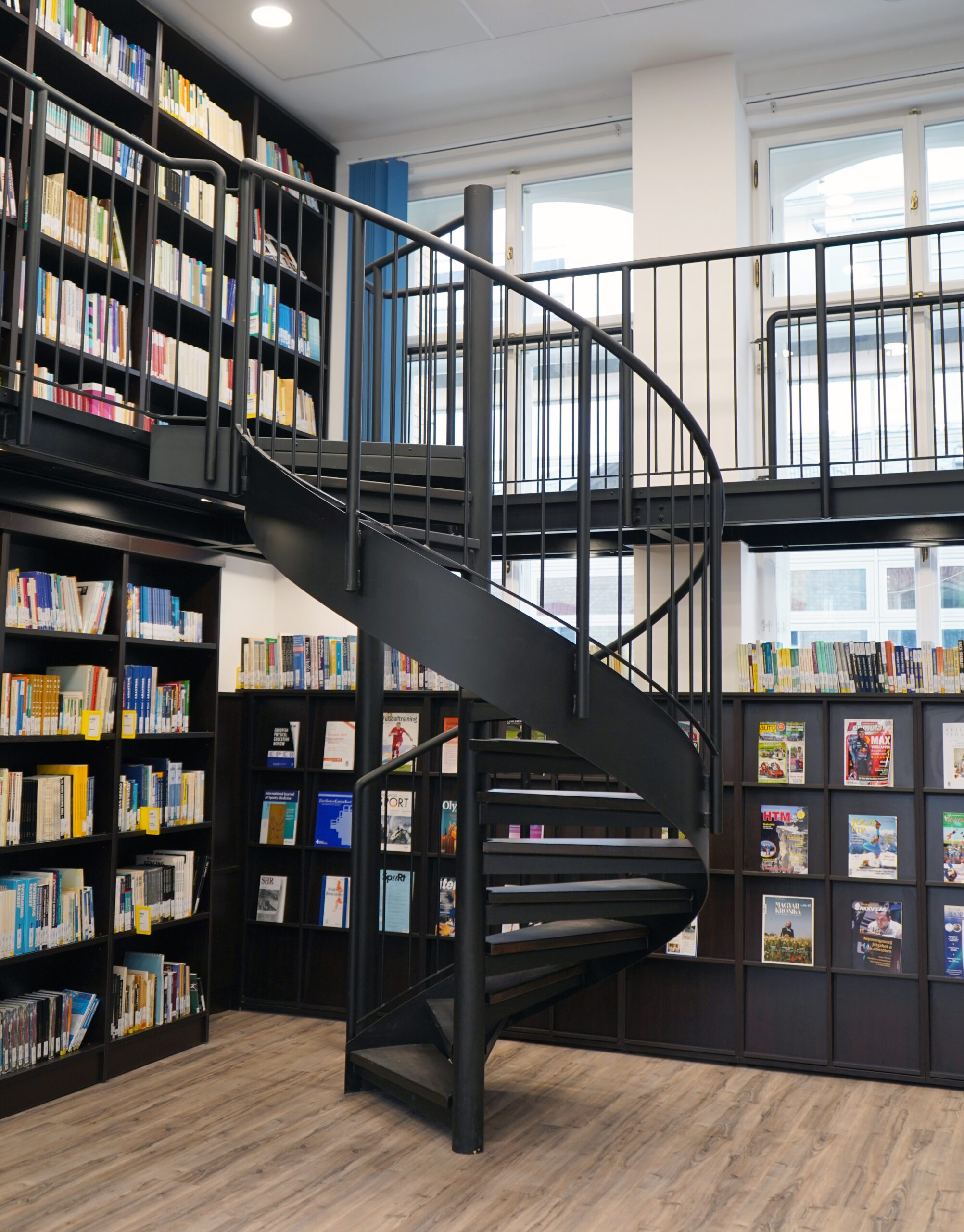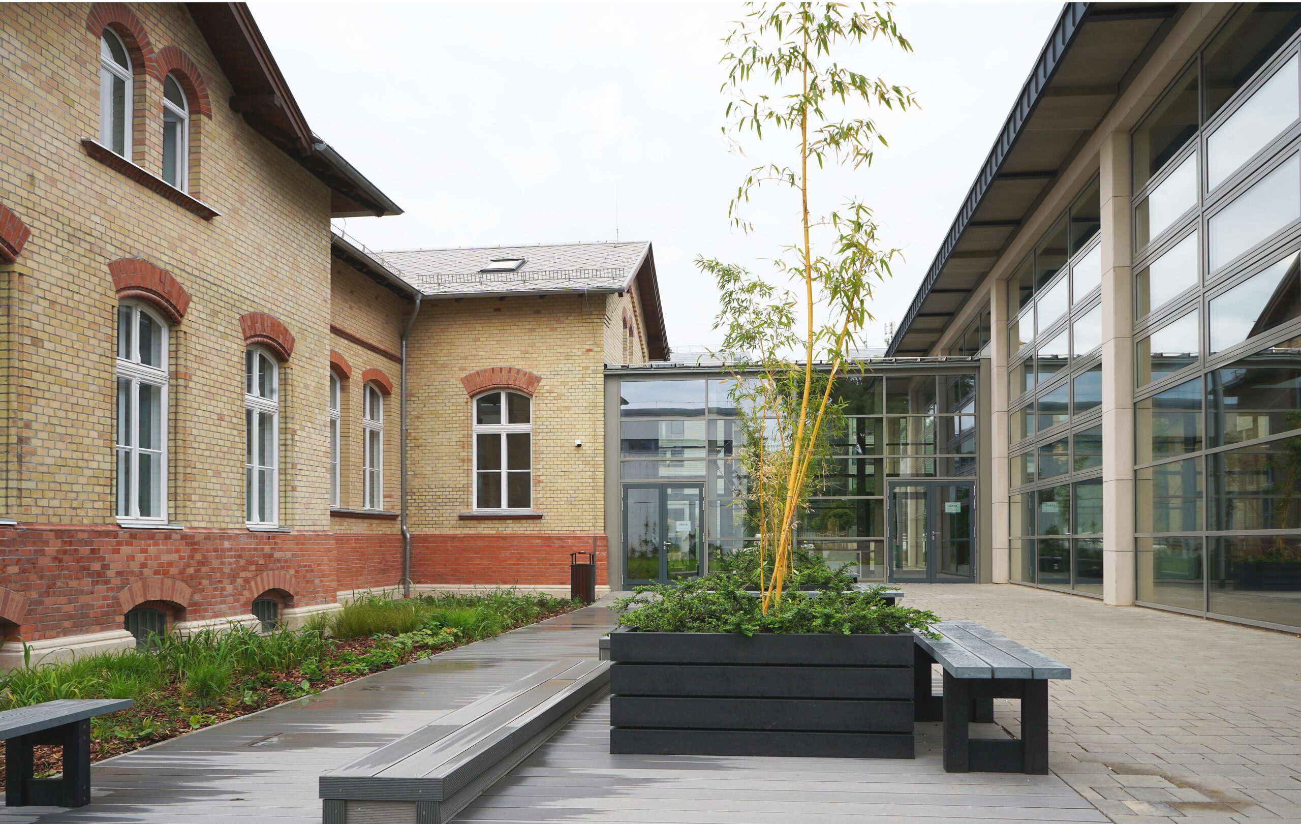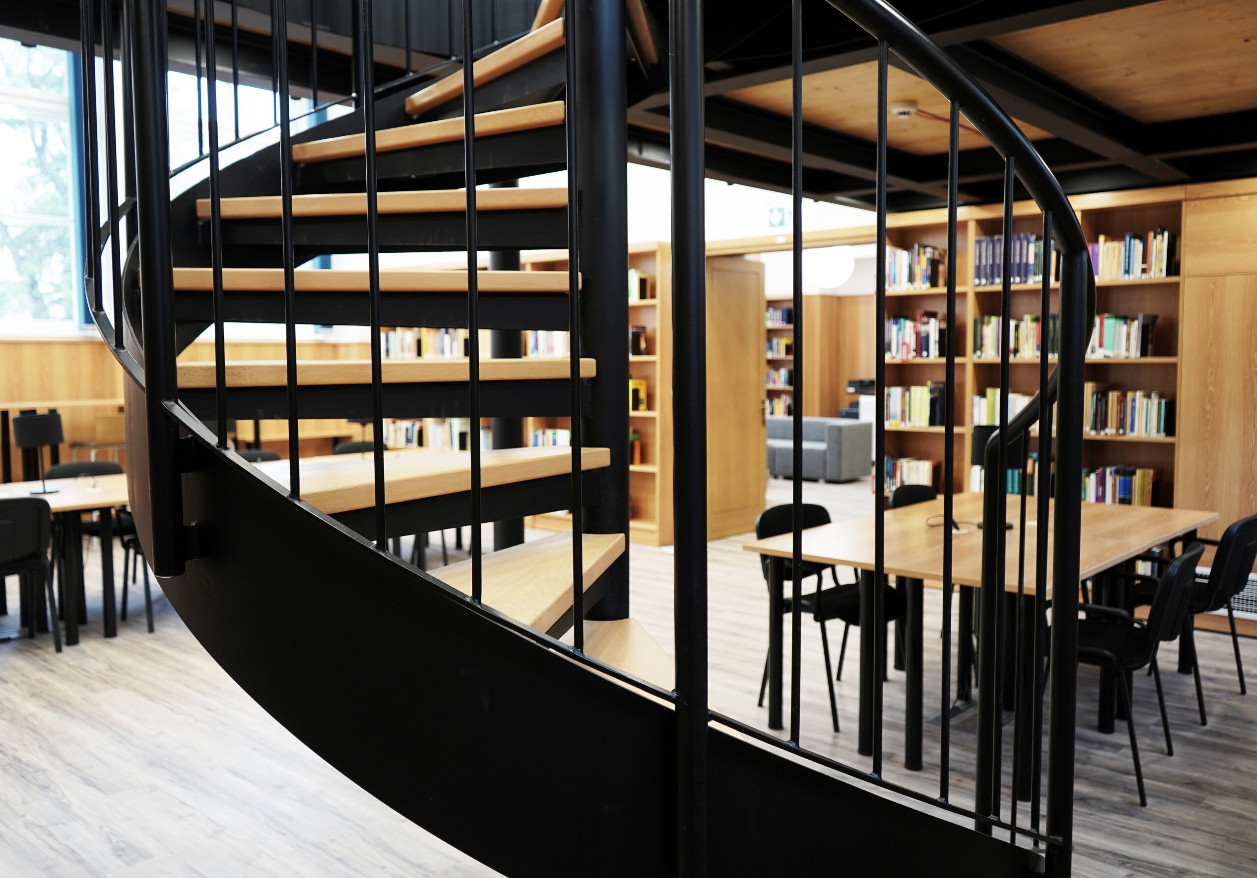 Az egyetem központi épületének átépítése során a B08 épület bontásra volt ítélve és a központi épület tervezésénél az épülettel nem is számoltak. A „K” épület építés ideje alatt született az örökségvédelmi döntés, hogy az épületet meg kell tartani. A programterv szerint az egyetemi könyvtár kerül itt elhelyezésre, ennek belsőépítészeti tervezése volt a feladatom. Az épület földszintjén az egyetemi könyvtár közönségforgalmi terei, szabadpolcos könyvespolcok, olvasótermek, folyóirat olvasó, oktatóterem, tárgyaló-hagyatéki szoba kerül kialakításra. A tetőtér és a földszint között könyvlift segítségével tudják küldeni fogadni a recepción dolgozók a könyveket. A könyvtárba belépve egy nagy belmagasságú, világos térbe érünk. Az információs pult fekete-narancs színe, egyszerű íves vonalvezetése, a világos burkolatok modern fogadóteret alkotnak. A bejárati rész, és a tőle balra eső olvasó terek világos fa burkolatúak, világos natúr színű szabad polcokkal, semleges szürke színű meleg, de nagy kopásállóságú vinyl burkolattal. A világos fa asztalok, a szürke-narancs székek kényelmes, esztétikus teret biztosítanak a könyvtár közönségének. A kialakított galéria acél szerkezetű, fa járófelülettel. A galériára betervezett 4 fiatalos, hatalmas fotel lehetőséget biztosít a nyugodt olvasásra. A bejárati előcsarnoktól jobbra eső olvasó hagyományos kialakítású tér, mintha egy időutazásban venne részt az olvasó. A bútorok sötét dió színűek, kényelmes sötét ülőgarnitúrák, mívesen kialakított acél szerkezetű galéria, hagyományos megjelenésű design lámpák biztosítják a „más típusú” hangulatot. Az álmennyezetek tervezésénél figyelembe kellett venni a galéria és a nagy összefüggő terek változó belmagasságát, a gépészeti berendezések helyigényét. Az álmennyezeti síkok különböző magasságúak, a monolit részekbe kazettás álmennyezeti szakaszok kerültek, így biztosítottuk, hogy a gépészeti berendezésekhez hozzá lehessen férni.